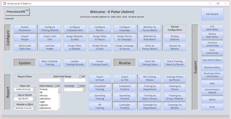 An Administrator has full authorization to configure the PrecisionLMS TM system, invoke all reports, and conduct their own training requirements.