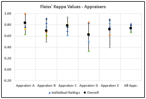 Examples of Attribute R&R charts (Confidence Limits, Fleiss’ Kappa Values, and Kendall’s Correlation):