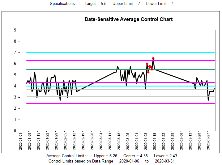 The program also displays the data in both “even spacing” and “date-sensitive” manner. Typical control charting programs show the data points spaced evenly along the X-axis. But making the X-axis date-sensitive helps highlight the seasonality or the impacts of factory shutdowns and start-ups.